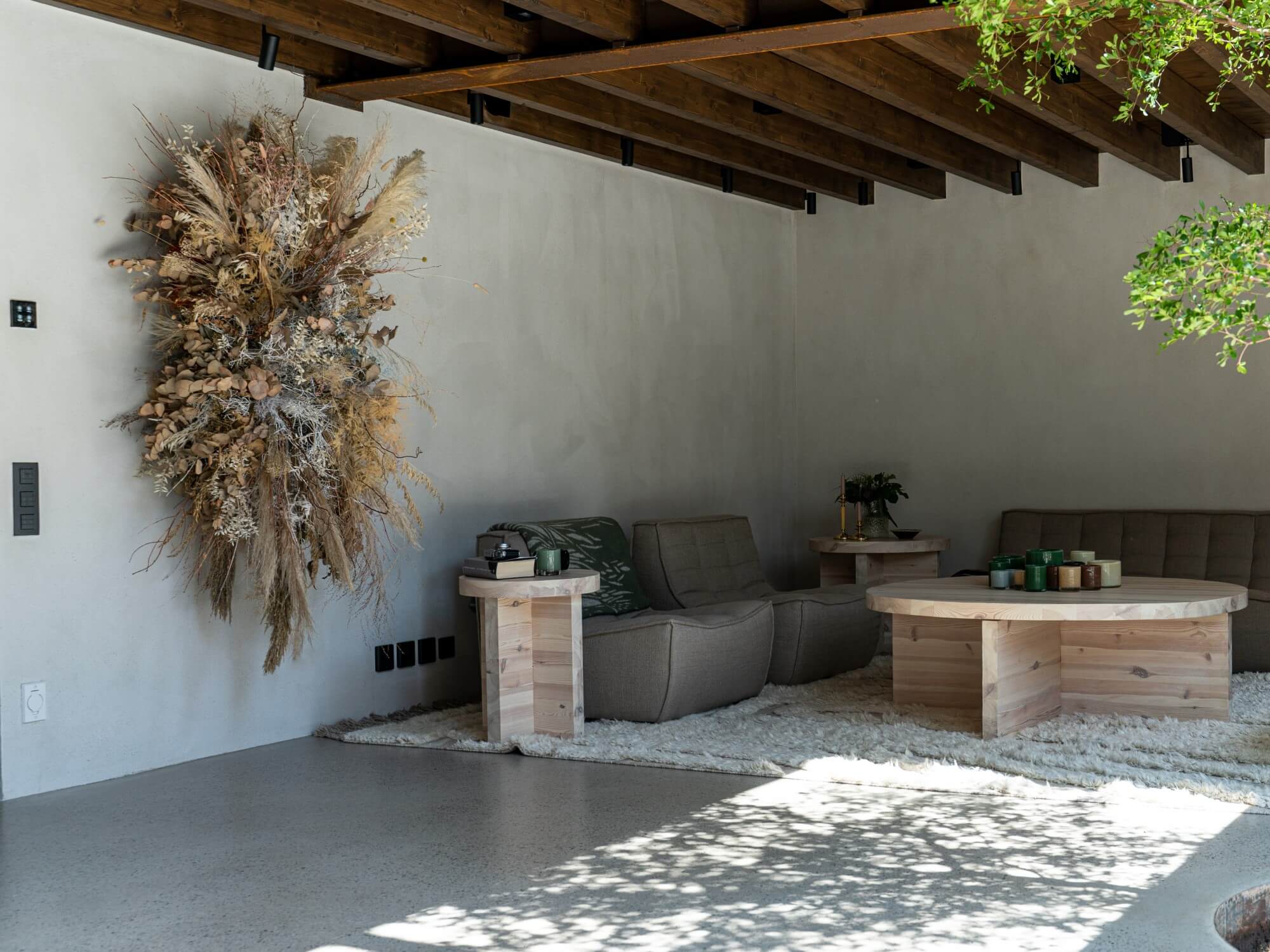 “Vi behöver inte klä det i en massa inredning, det är vackert och avskalat som det är”, säger han. I hemmet finner man mycket naturmaterial som på ett fint sätt samspelar med naturen utanför. Robin berättar att de till och med har planterat ett träd i vardagsrummet.